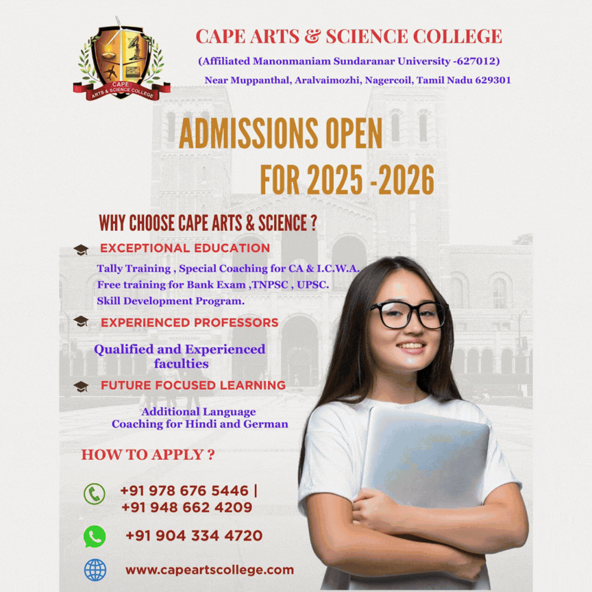 CAPE Arts & Science College is a premier institution dedicated to providing quality higher education with a strong focus on academic excellence, character building, and employability. Affiliated to Manonmaniam Sundaranar University, the college offers well-structured undergraduate and postgraduate programmes that cater to the evolving needs of students and society. Located in a serene and eco-friendly campus near Aralvaimozhi, the institution creates an ideal learning environment that nurtures intellectual growth, ethical values, and social responsibility.